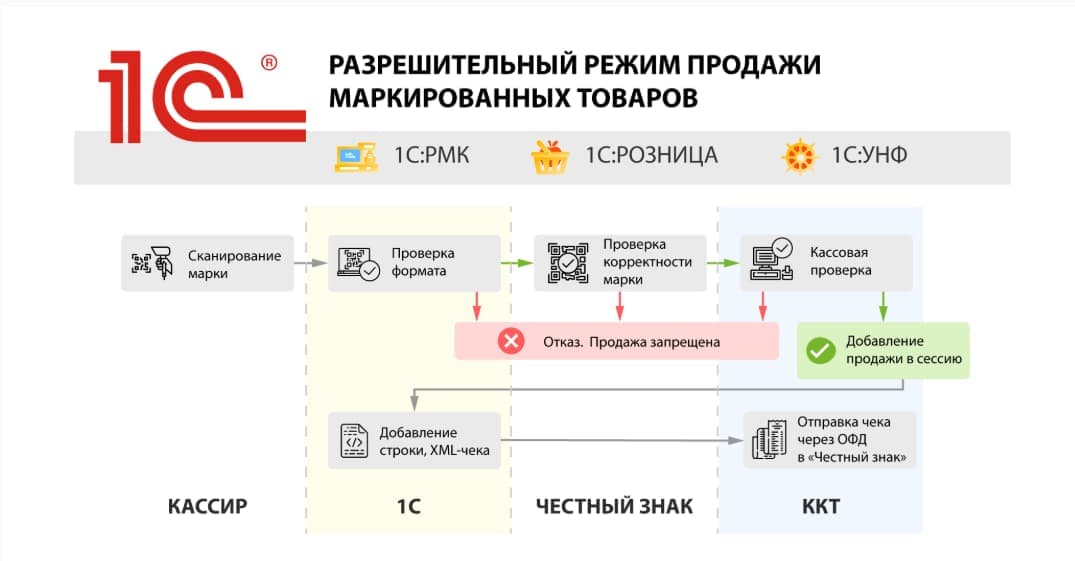 1С: Розница интегрирована с системами маркировки и позволяет работать со следующими маркированными товарами: обувь и одежда, молоко, шины, фотоаппараты, табак, алкоголь и т.д.